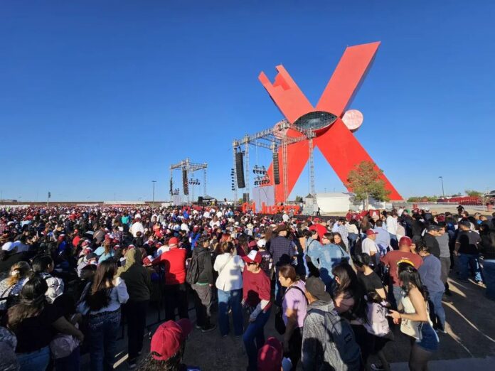 Ciudad Juárez, Chih. (ADN/Staff) – El alcalde de Ciudad Juárez, Cruz Pérez Cuéllar, encabezó un evento masivo en la Plaza de la Mexicanidad, donde más de 50 mil personas se congregaron en una jornada que combinó espectáculo musical y posicionamiento político.