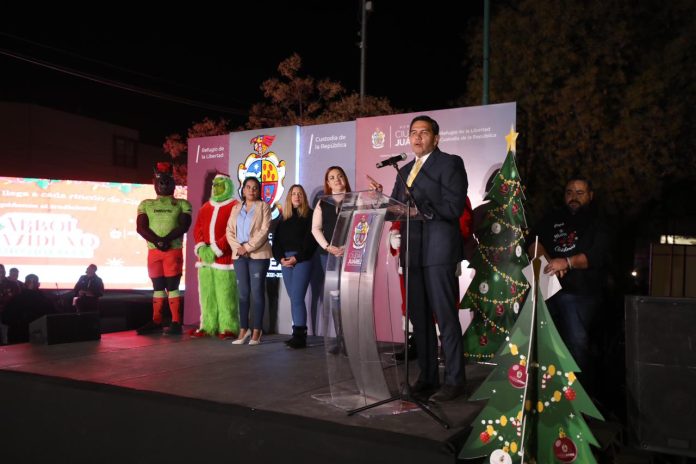 Durante el encendido del árbol, Karen Mora, coordinadora de Atención Ciudadana del Suroriente, expresó sentirse contenta de trabajar a favor de ese sector de Juárez y señaló que el personal de la coordinación estará laborando en campo a través del trato directo con cada ciudadano.