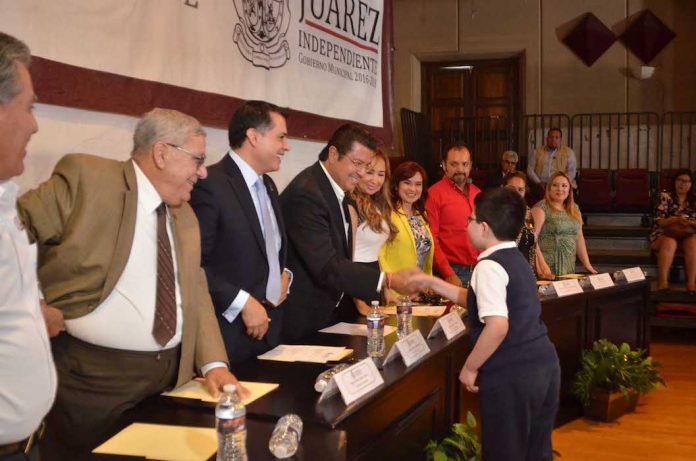 Ciudad Juárez, Chih. – Ustedes son niños y niñas excelentes, dijo el Presidente Municipal, Armando Cabada Alvídrez, al referirse a los 120 estudiantes de nivel básico a los que esta tarde les hizo entrega de igual número de becas educativas, en respuesta al acuerdo aprobado durante la sesión de cabildo en la que participaron el 28 de abril pasado.