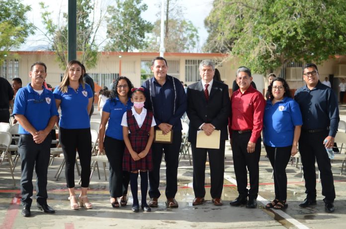 El edil estuvo acompañado en el presídium por Maurilio Fuentes Estrada, titular de la Subsecretaría de Educación en la zona norte; Karina Ayeli Snyder Ramos, directora del turno matutino; Saúl Loya Palafox, supervisor de la zona 32; Flavio Ruiz López, director del turno vespertino y José Ramiro Martínez, coordinador de educación en la zona norte.