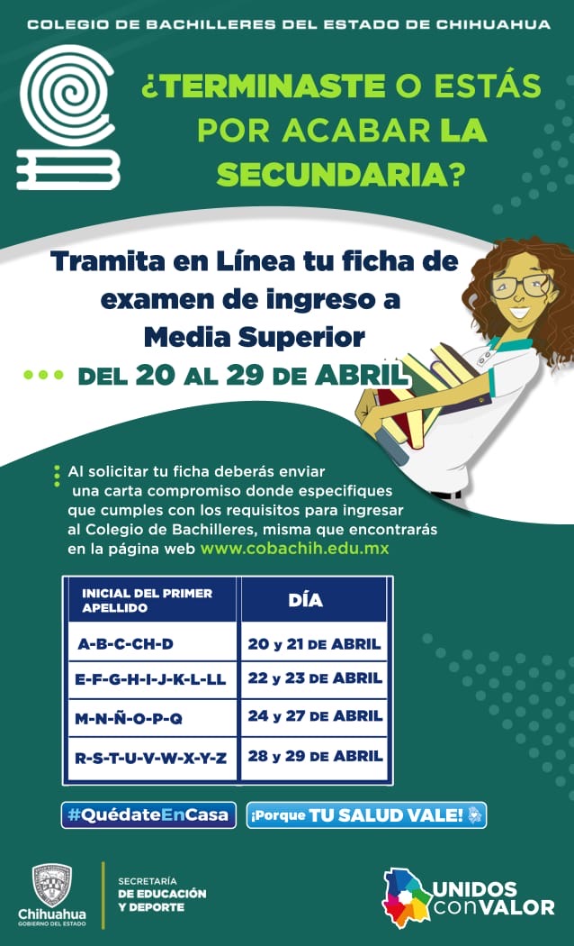 Chihuahua, Chih. – Los estudiantes próximos a egresar de secundaria podrán acceder a la ficha de admisión al Colegio de Bachilleres del Estado de Chihuahua en línea, a través del portal www.cobachih.edu.mx a partir del lunes 20 hasta el miércoles 29 de abril del año en curso.