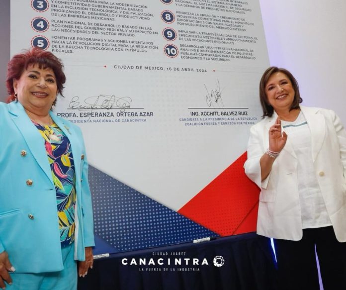 Ciudad Juárez, Chih (ADN/Arturo Hernández) – Isela Molina Alcay, presidenta de Canacintra Juárez, informó que, durante la reunión nacional del organismo, se le entregó a Xóchitl Gálvez, candidata de la Coalición Fuerza y Corazón por México, un documento que contiene propuestas y peticiones surgidas de los foros de participación “La Fuerza de las Propuestas”, llevados a efecto recientemente.