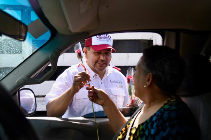 El candidato a la alcaldía por la coalición “Sigamos Haciendo Historia por Chihuahua”, Cruz Pérez Cuéllar, felicitó y entregó rosas a madres de familia en cruceros viales y restaurantes de la ciudad.