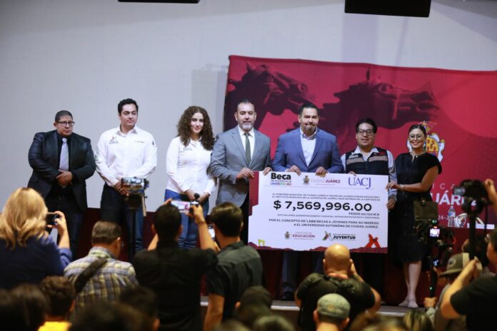El Gobierno Municipal, a través del Instituto Municipal de la Juventud, entregó de manera simbólica un cheque por 7 millones 569 mil 996 pesos a la Universidad Autónoma de Ciudad Juárez (UACJ), como parte del Programa Becas de Acceso a la Universidad.