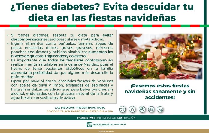 Recomendó menús que contemplen el pavo al horno (sin mucha grasa), ensaladas frescas de verduras con aceite de oliva y limón, ensalada de espinacas y fruta, pero sin endulzantes adicionales, , y para beber dijo que es preferente utilizar ponches sin alcohol, endulzados con la glucosa natural de la fruta y aguas frescas con sustitutos de azúcar.