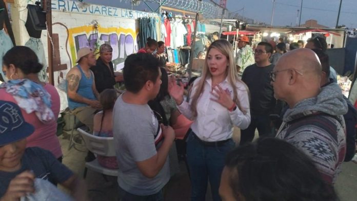 La diputada federal Daniela Álvarez se acerca a los ciudadanos en un recorrido nocturno por el Mercado Che Guevara de Ciudad Juárez, escuchando sus necesidades y comprometiéndose a atender sus gestiones.