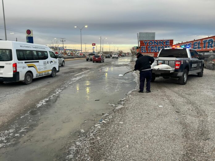 Con la finalidad de evitar cualquier tipo de incidentes, agentes de la Coordinación General de Seguridad Vial, esparcieron sal sobre vialidades que presentaban hielo y a su vez representan peligro tanto para conductores como peatones.