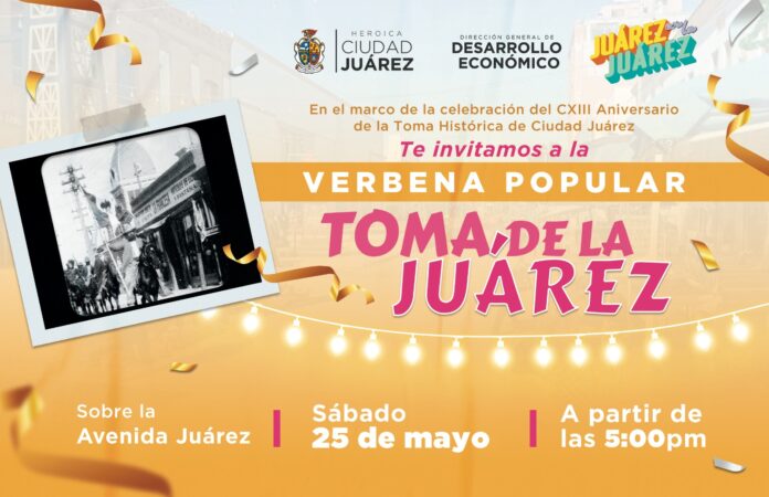 Dentro del marco del 113 aniversario de la Toma de Ciudad Juárez, comerciantes de la avenida Juárez llevarán a cabo una verbena popular el próximo 25 de mayo.
