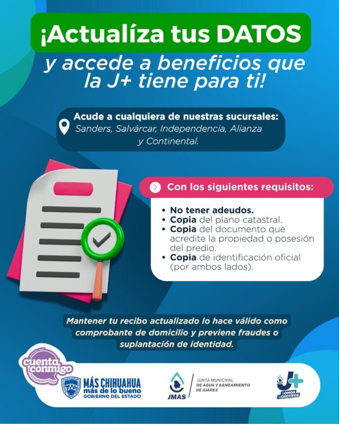 Ciudad Juárez, Chih .- Para actualizar sus datos, los usuarios de la J+ pueden acudir a cualquiera de nuestros centros de atención, ubicados en Continental, Sanders, Salvárcar, Independencia y Plaza Alianza, donde podrán realizar los ajustes necesarios.
