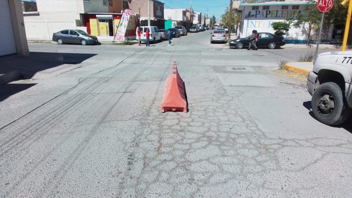 Ciudad Juárez, Chih .- Un ejemplo de ello es el hundimiento que se encuentra en el cruce de las calles Floricultores y CTM, Inf. Fidel Velázquez, en donde el área correspondiente colocó desde el pasado 28 de marzo una barrera, la cual, en una visita que se dio este día al lugar, se detectó fue removida.