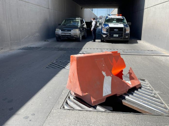 Lo anterior debido a un desperfecto en la rejilla metálica que cubre el desagüe del mencionado paso a desnivel, la cual estaba exponiendo a los conductores que transitan por el lugar a ser protagonistas de algún incidente vehicular, razón por la que se optó inhabilitar el carril de izquierdo tras colocar la debida señalización vial para desviar el tráfico por el carril de la derecha.