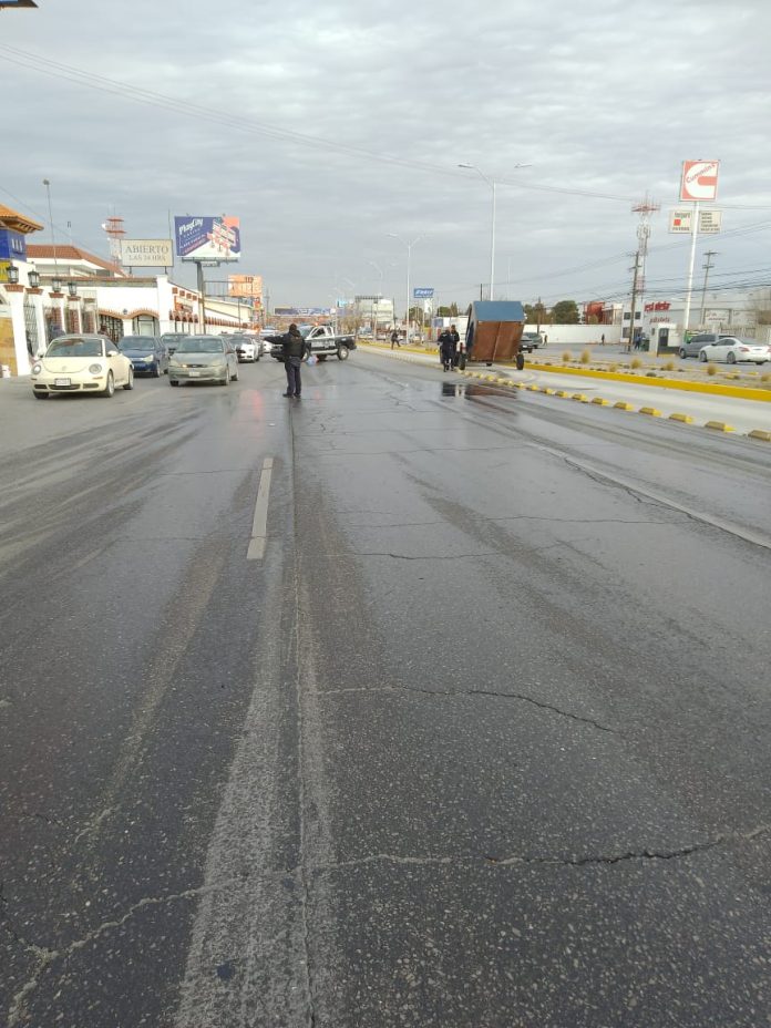 Ciudad Juárez, Chih .- Por el momento se mantienen cerrados dos carriles a la circulación vehicular, ya que tras el derrame del Diesel se comenzaron a realizar los respectivos trabajos de esparcimiento de arena para absorción en un área de 100 metros aproximadamente, a fin de evitar derrapes sobre el asfalto.
