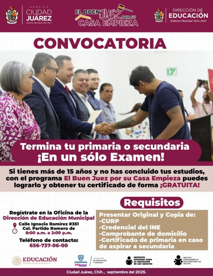 La Dirección de Educación Municipal exhorta a personas mayores de 15 años a obtener su certificado de primaria o secundaria a través del programa “El buen juez por su casa empieza”.