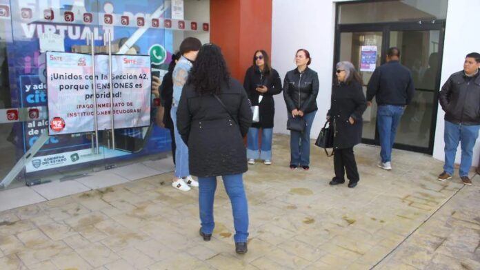 Ciudad Juárez, Chih (ADN/Arturo Hernández) .– Miembros de la Sección 42 del SNTE se manifestaron este día a la entrada de Pensiones Civiles del Estado (PCE) en esta frontera, para exigir el cese del titular de la dependencia, Sergio Alberto Soto.