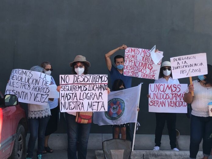 Ciudad Juárez, Chih. (ADN / Martín Orquiz) – Por segunda ocasión en el año, media centena de integrantes de la Unión Nacional de Comités del Instituto Mexicano del Seguro Social (Uncimss) se apostó en las instalaciones de la administración local del Servicio de Administración Tributaria (SAT) para exigir la entrega de sus ahorros depositados en cuentas de cesantía y vejez.
