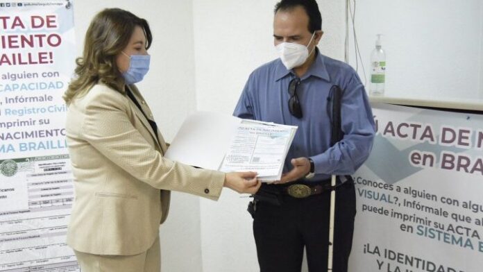 Ciudad Juárez, Chih .- La Dirección del Registro Civil del Estado de Chihuahua inició la emisión de actas de nacimiento y Clave Única del Registro de Población (CURP) en sistema Braille, lo cual hace más accesible la comprensión y manejo de documentos oficiales a las personas con discapacidad visual.