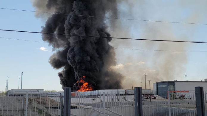 Ciudad Juárez, Chih. (ADN / Martín Orquiz) – Tras una aparente explosión, un almacén de una maquiladora ubicada en el perímetro del Parque Industrial Libramiento, ubicado al sur oriente de la ciudad, provocó un incendio de grandes dimensiones que generó la intensa movilización de los cuerpos de seguridad pública y Protección Civil.