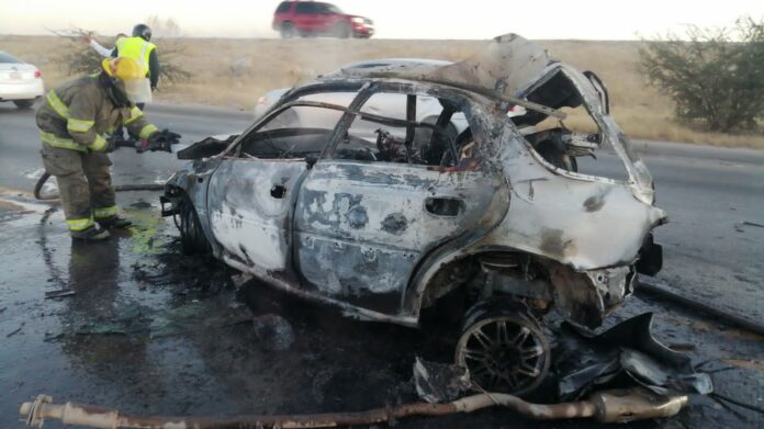 La mañana de este miércoles, un automóvil termino calcinado a causa de una explosión, en hechos ocurridos en el bulevar Juan Pablo II a 1 kilómetro de la Francisco Villareal Torres, como resultado de un choque por alcance.