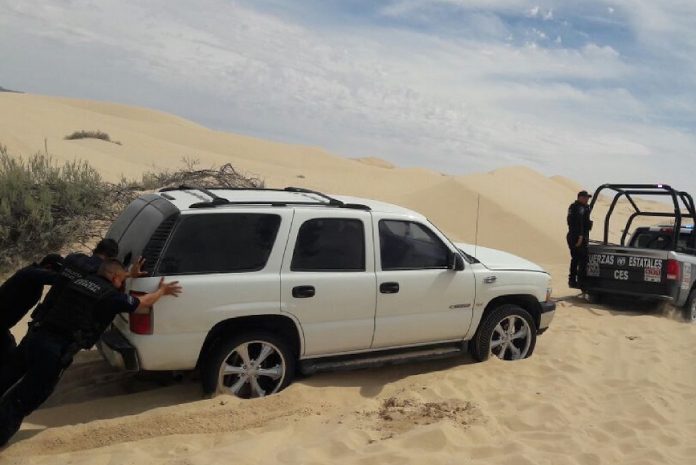 En las Dunas de Samalayuca, un Jeep se volcó, lo cual provocó que tres personas de sexo masculino y una mujer sufrieran lesiones.