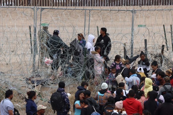 La malla con alambre de púas se encuentra sobre el borde del Rio Bravo a la altura del lugar conocido como la Puerta 36, en donde quienes lograron cruzar están a la espera de la llegada de las unidades de la Patrulla Fronteriza para ser llevados a los centros de detención.