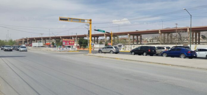 Ciudad Juárez, Chih .- Este semáforo se encuentra a la altura de los trabajos que está realizando la Junta Municipal de Agua y Saneamiento (JMAS) en ese sector y que en días próximos habrá de terminarse el tramo que va desde la calle Helio hasta el Arroyo de las Víboras.