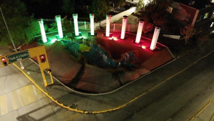 En el marco de la celebración del Día de la Independencia, el Gobierno Municipal iluminó de colores patrios varias fuentes y monumentos de la ciudad, con la finalidad de ofrecer un espectáculo nocturno a los juarenses.