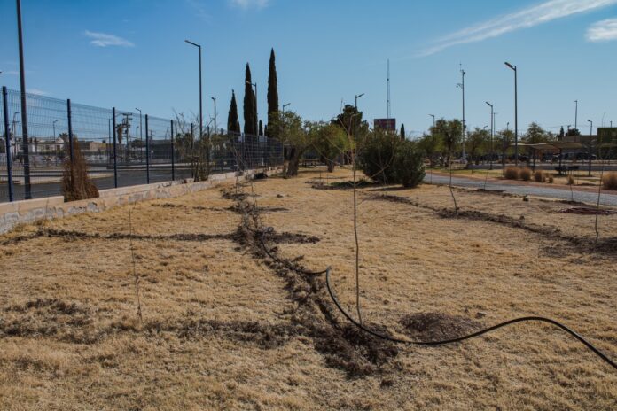 Ciudad Juárez, Chih .- Hasta el momento, se han colocado 600 metros de manguera con goteros regulables, lo que permitirá una distribución eficiente del agua, para el riego tanto de los árboles recientemente plantados, como de los ya existentes.