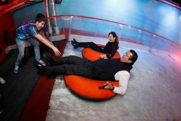 El Presidente Municipal, su esposa y su hija se deslizaron por el tobogán y patinaron a bordo de triciclos en la pista de hielo.