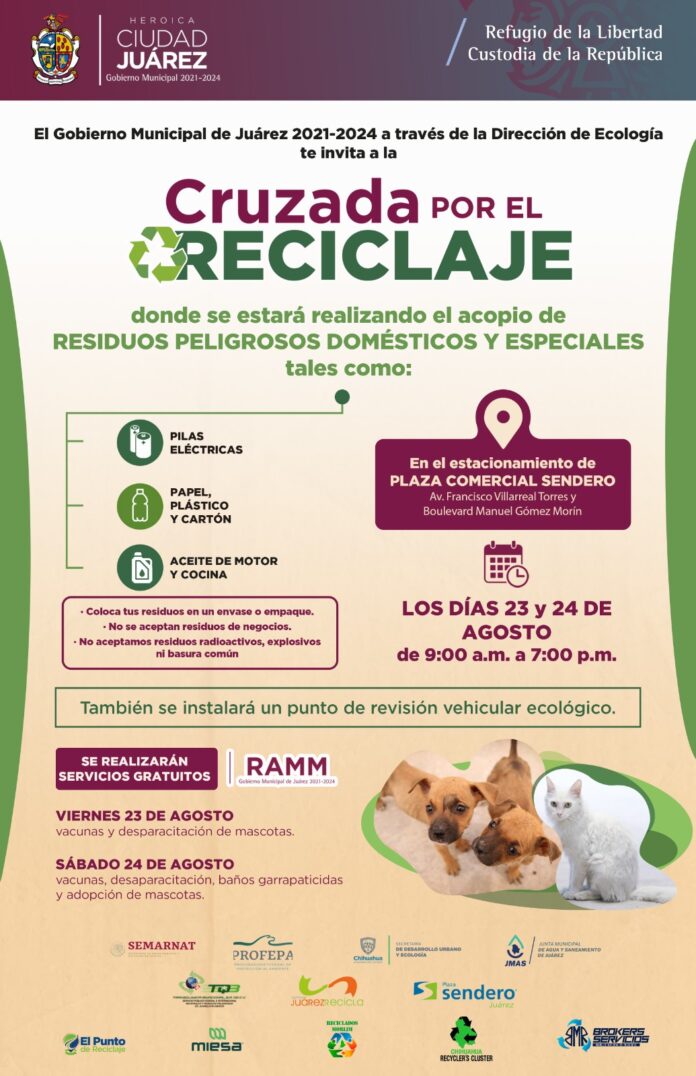 La Dirección de Ecología llevará a cabo mañana y el sábado la Cruzada por el Reciclaje en la Plaza Comercial Sendero, ubicada entre Manuel Gómez Morín y Valle del Sol.