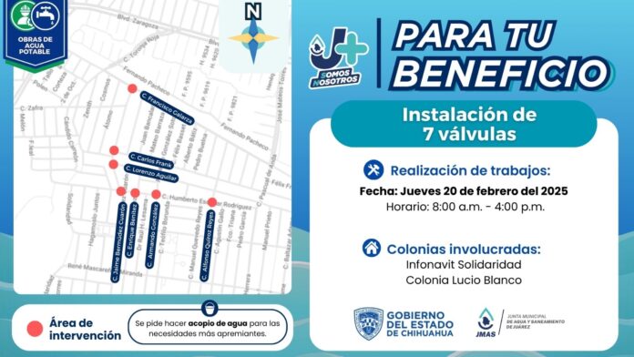 Ciudad Juárez, Chih .- Estos trabajos se realizarán mañana jueves 20 de febrero, entre las 8:00 y las 16:00 horas y forman parte del programa de Sectorización que lleva a cabo la Junta de Agua y Saneamiento de Juárez.