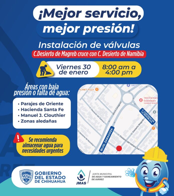 Ciudad Juárez, Chih. (ADN/Staff) – La Junta Municipal de Agua y Saneamiento (JMAS) de Juárez informó que este viernes 30 de enero realizará la instalación de dos válvulas de seccionamiento en el sector suroriente de la ciudad, como parte de las acciones para mejorar el control y la eficiencia en el suministro de agua potable.