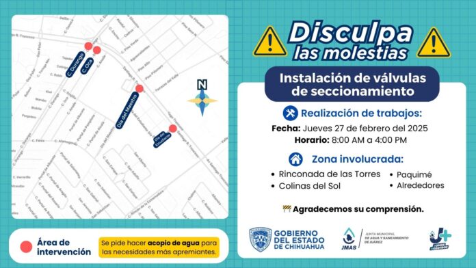 Durante el tiempo de ejecución de estas obras, se verá impactado el suministro de agua potable en la zona de Rinconada de las Torres, Colinas del Sol, Paquimé y alrededores.