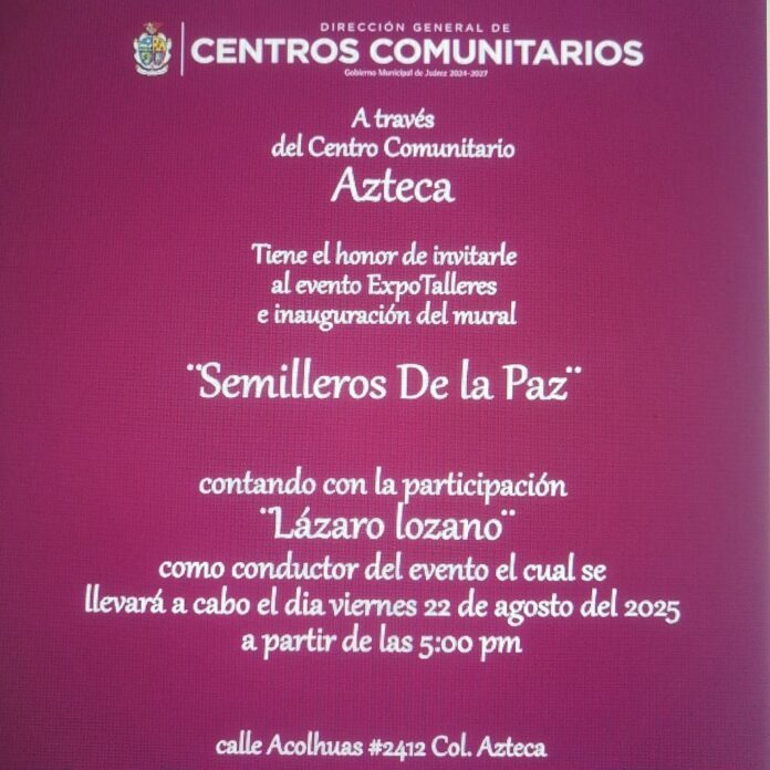 La Dirección de Centros Comunitarios invita este viernes 22 de agosto al evento de expo talleres, así como a la inauguración de un mural, con la participación del colectivo Semilleros de la paz.