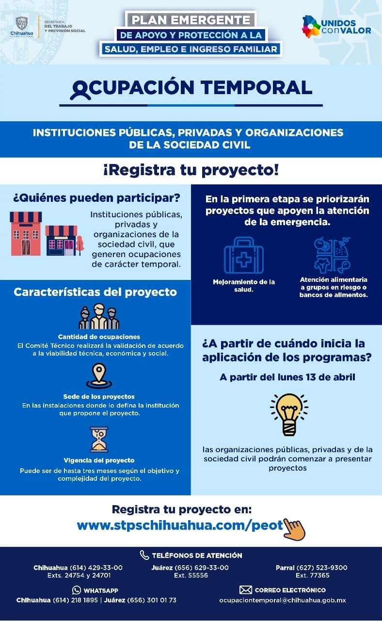 Chihuahua, Chih. – Como parte del Plan Emergente de Apoyo y Protección a la Salud, Empleo e Ingreso Familiar de Gobierno del Estado de Chihuahua, la Secretaría del Trabajo y Previsión Social (STPS), invita a instituciones públicas y privada, así como a las organizaciones de la sociedad civil que se encuentren legalmente constituidas a participar en el Plan Emergente de Ocupación Temporal.