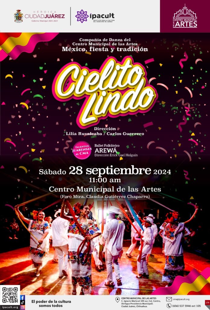 El Instituto para la Cultura del Municipio de Juárez (IPACULT) extiende una invitación a la comunidad para disfrutar del espectáculo de danza “Cielito Lindo”, que se llevará a cabo este sábado 28 de septiembre a las 11:00 de la mañana en el foro “Claudia Gutiérrez” del Centro Municipal de las Artes (CMA).