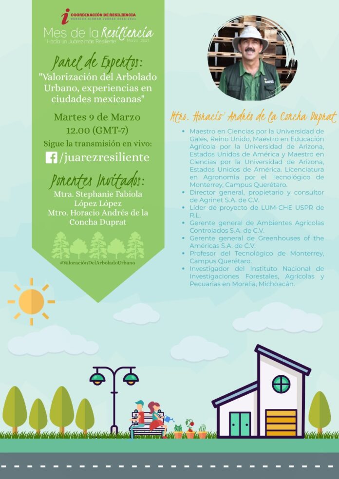 Ciudad Juárez, Chih.- En el marco del Mes de la Resiliencia, el Gobierno Municipal, invita a la comunidad a participar en el panel, “Valorización del Arbolado Urbano, experiencia en ciudades mexicanas”, que se realiza hoy a través de la Coordinación de Resiliencia, de manera virtual.
