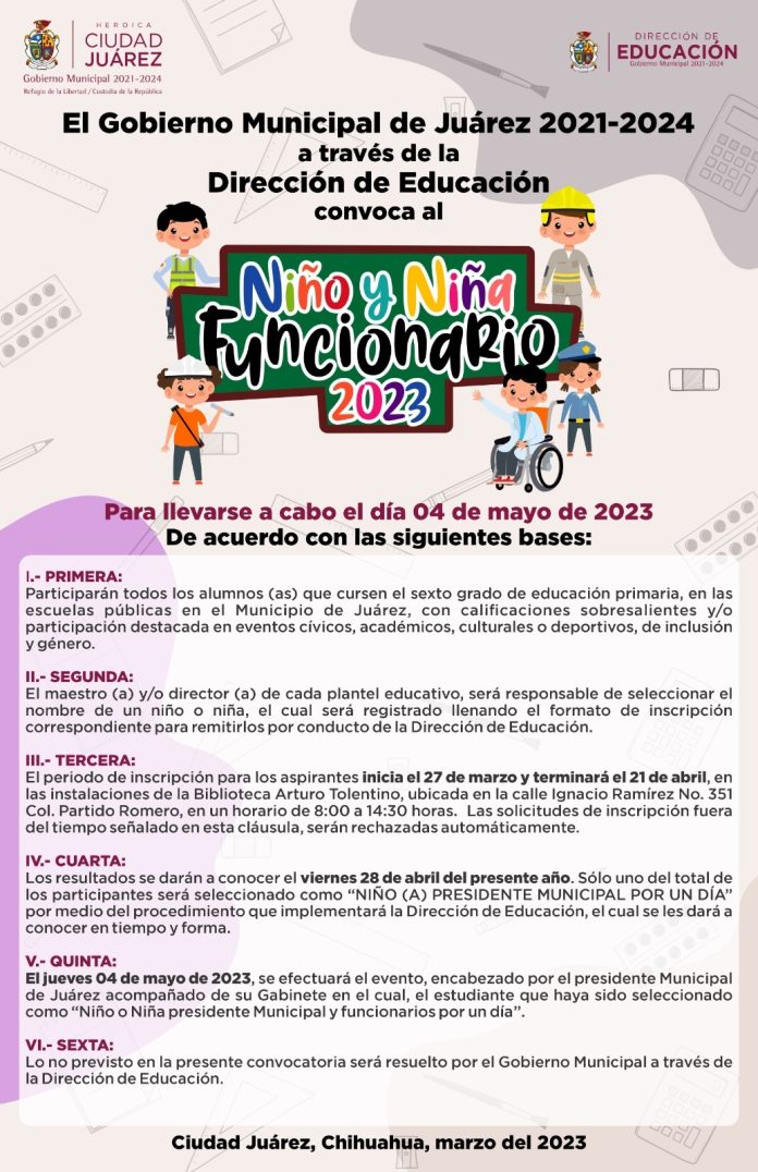 Los resultados se darán a conocer el 28 de abril y solo un alumno del total de participantes será seleccionado como niño o niña presidente municipal por un día, por medio de un procedimiento que implementará la Dirección de Educación, el cual se dará a conocer a tiempo.