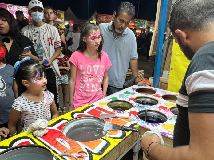Ciudad Juárez, Chih .- Este módulo es atendido por Roberto, quien instruye a los interesados colocando su mano dentro de la cera para posteriormente pasarla por dos o tres colores de su elección.