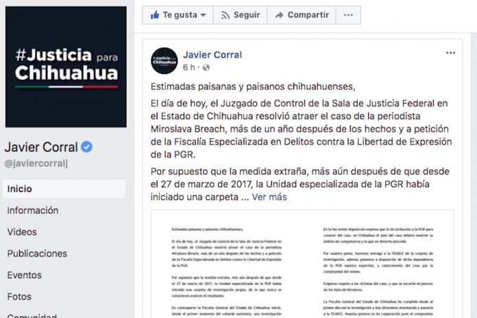 Chihuahua, Chih. – El gobernador del Estado de Chihuahua, Javier Corral Jurado, publicó anoche en su cuenta de facebook el siguiente mensaje relativo al caso Miroslava Breach.