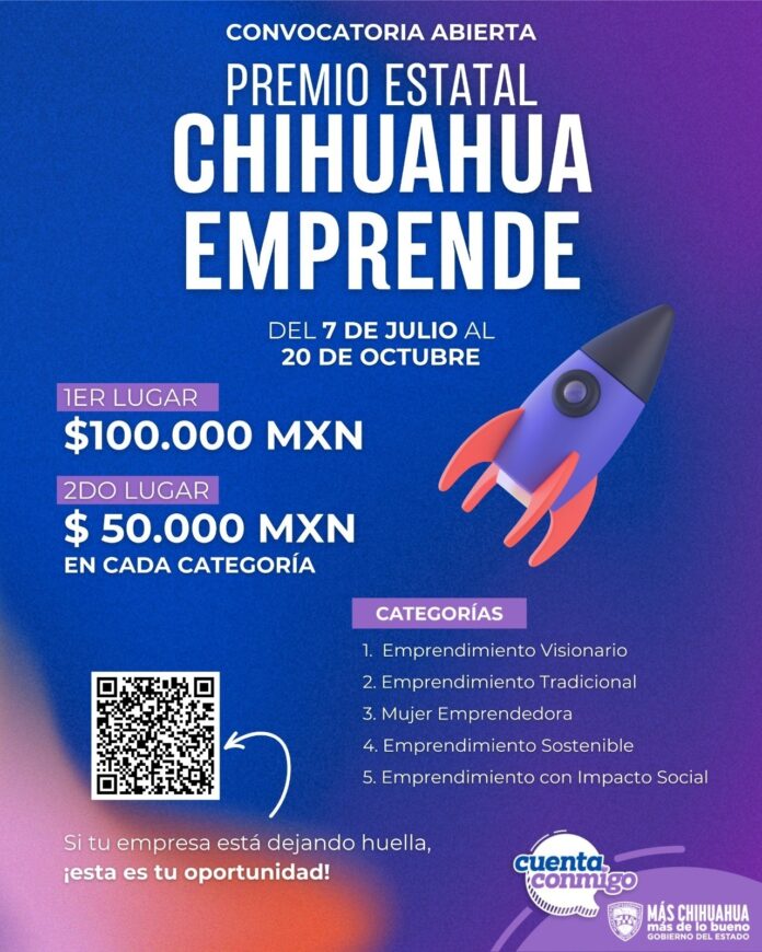 Las personas interesadas pueden obtener más detalles y registrar sus proyectos escaneando el código QR disponible en el material de difusión o visitando el sitio web oficial: www.chihuahua.com.mx/emprende, para descargar la convocatoria y postular su proyecto.