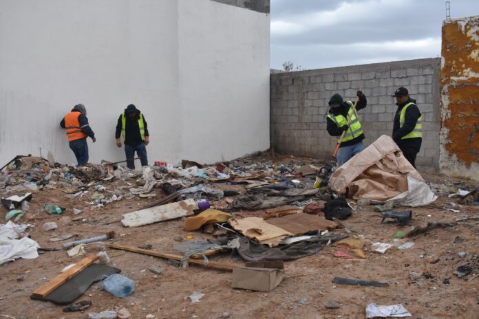 Ciudad Juárez, Chih .- Gibran Solís Kanahan, encargado de despacho de la Dirección de Limpia, indicó que el lote colinda con la barda de la primaria Leona Vicario y se encuentra frente a la Secundaria Federal 18, por lo que destacó que estas labores coadyuvan a la seguridad de los padres de familia y estudiantes.