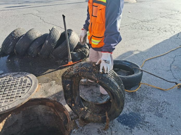 Ciudad Juárez, Chih .- Llantas y basura diversa siguen encontrando las cuadrillas de la J+ en el drenaje sanitario de Ciudad Juárez, desechos que generan los brotes de aguas negras.