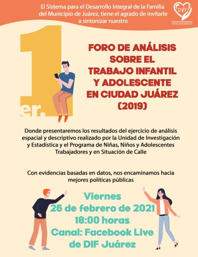 Ciudad Juárez, Chih.- El DIF Municipal presentará este viernes su primer Foro de Análisis sobre el Trabajo Infantil y Adolescente en Ciudad Juárez (2019).