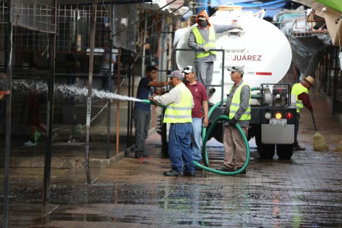 Ciudad Juárez, Chih .- El titular de la dependencia, Gibran Alhe Solís Kanahan, informó que en esta labor participaron 80 elementos y se utilizaron cuatro pipas de agua tratada de la Dirección de Parques y Jardines para lavar las calles y banquetas.