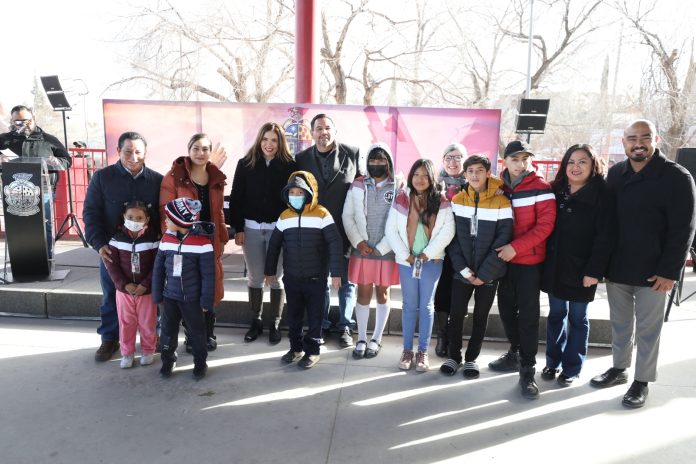 Ciudad Juárez, Chih .- Fueron 1,440 menores los que recibieron una de estas prendas de vestir de manos del Presidente Municipal, Cruz Pérez Cuéllar; de la presidenta del Sistema para el Desarrollo Integral de la Familia del Municipio (DIF), Rubí Enríquez; del director de Asentamientos Humanos, Julio de la Cruz y de otros funcionarios municipales.