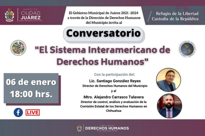 La Dirección de Derechos Humanos del Municipio llevará a cabo el tercer Conversatorio a través de su página de facebook, en el cual se abordará el tema del “Sistema Interamericano de Derechos Humanos”, donde se tendrá como invitado al director de Control, Análisis y Evaluación de la Comisión Estatal de Derechos Humanos en el Estado de Chihuahua, Alejandro Carrasco Talavera.