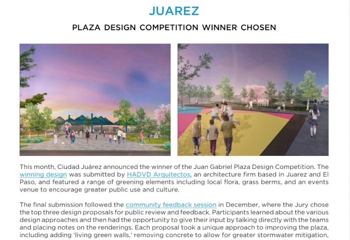 Ciudad Juárez, Chih. – El concurso de diseño “Embellezcamos La Gran Plaza Juan Gabriel” que recientemente realizó el Gobierno Municipal y la Oficina de Juárez Resiliente, fue publicado en una revista internacional.