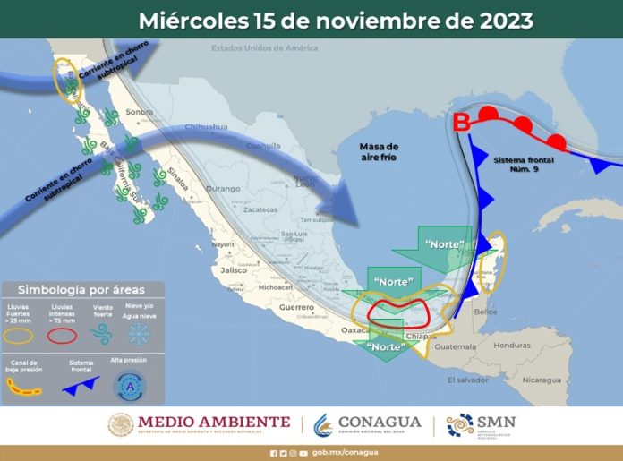 El Servicio Meteorológico Nacional informa que la masa de aire frío que impulsa al frente frío número 9, en interacción con el ingreso de humedad procedente del Océano Pacifico, la corriente en chorro y un canal de baja presión, favorecerán ambiente de frío a fresco por la mañana, de templado a cálido por la tarde, temperaturas muy frías con heladas en la zona serrana, cielo parcialmente nublado, vientos de 5 a 20 km/h. Sin lluvias.