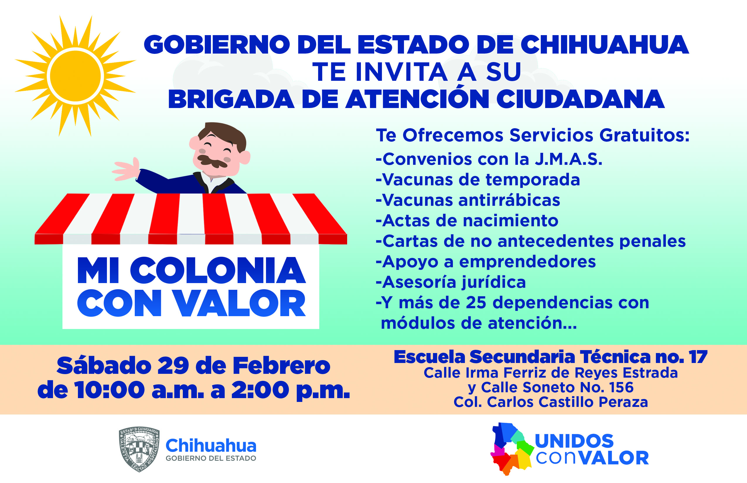 Ciudad Juárez, Chih. – Gobierno del Estado, a través de la Subsecretaría de Desarrollo Social, prepara la primera brigada de atención ciudadana “Mi Colonia con Valor” de este 2020, la cual se llevará a cabo en la Escuela Secundaria Técnica No. 17, ubicada en la colonia Carlos Castillo Peraza, el próximo 29 de febrero.