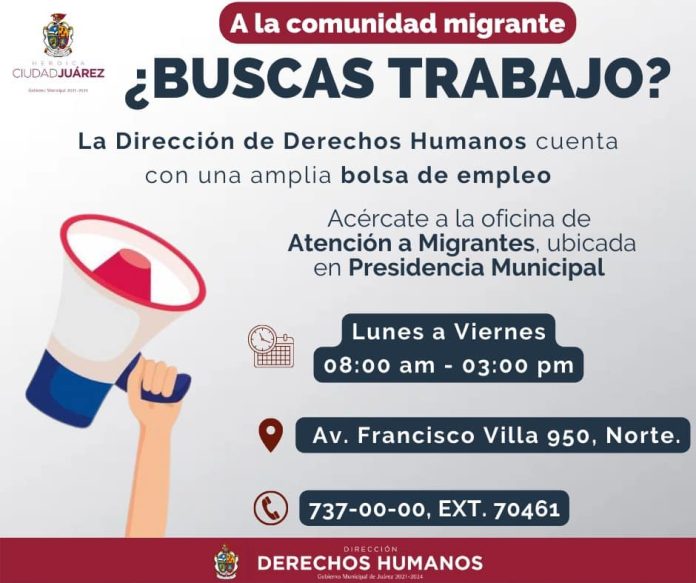 Ciudad Juárez, Chih .- “A la población en movilidad, tanto nacionales como extranjeros, se les auxilia para que puedan obtener sus documentos e integrarse a cualquiera de las empresas con las que se tiene una alianza y que buscan personas con distintas aptitudes y conocimientos”, dijo Santiago González Reyes, titular de la Dirección de Derechos Humanos.